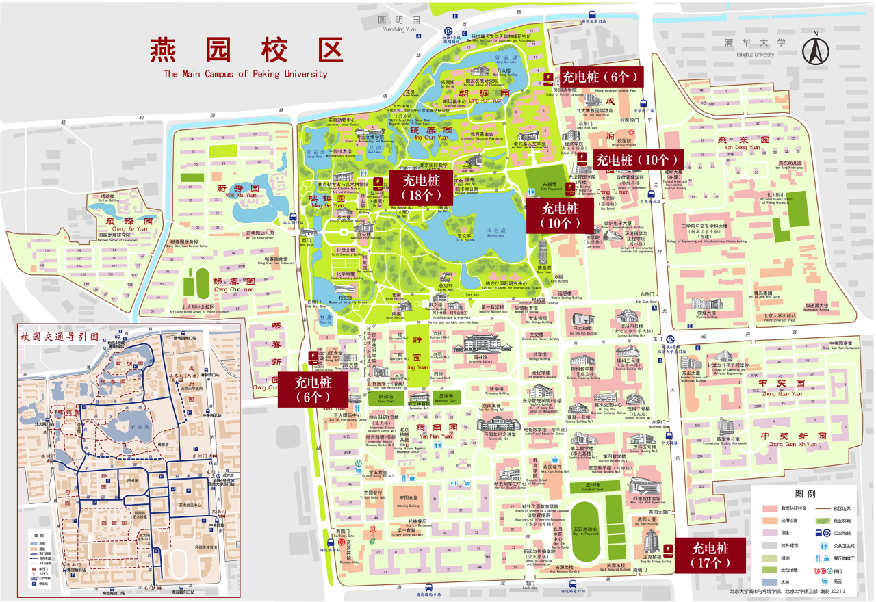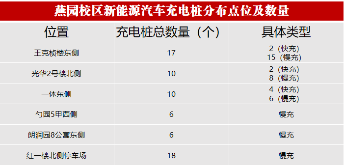 为方便教职员工新能源汽车充电,燕园校区共设置了7处65个户外充电点位,具体分布点位及数量情况如下: