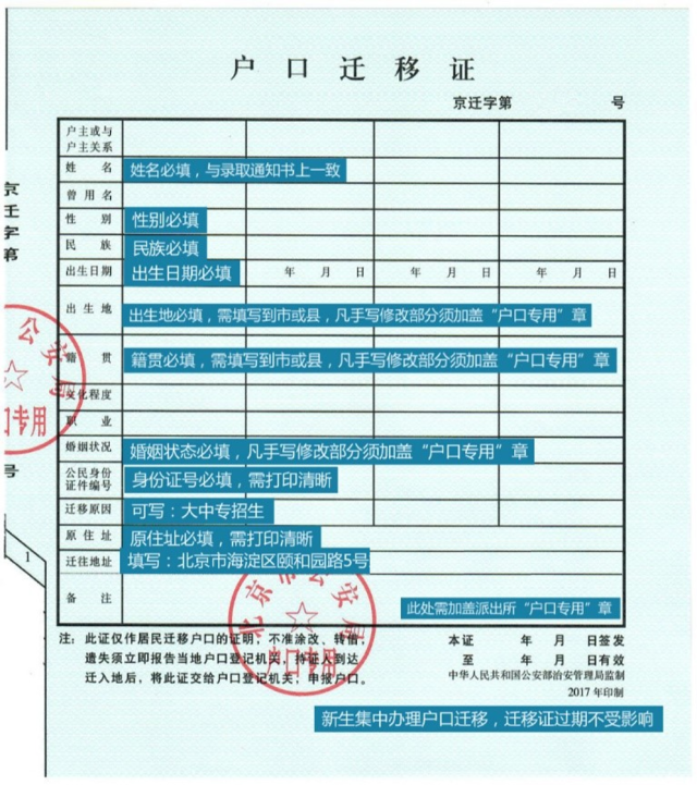 (3)户口迁移证的姓名、身份证号码要与入学前本人户口本、身份证、录取通知书一致,否则不予迁入。